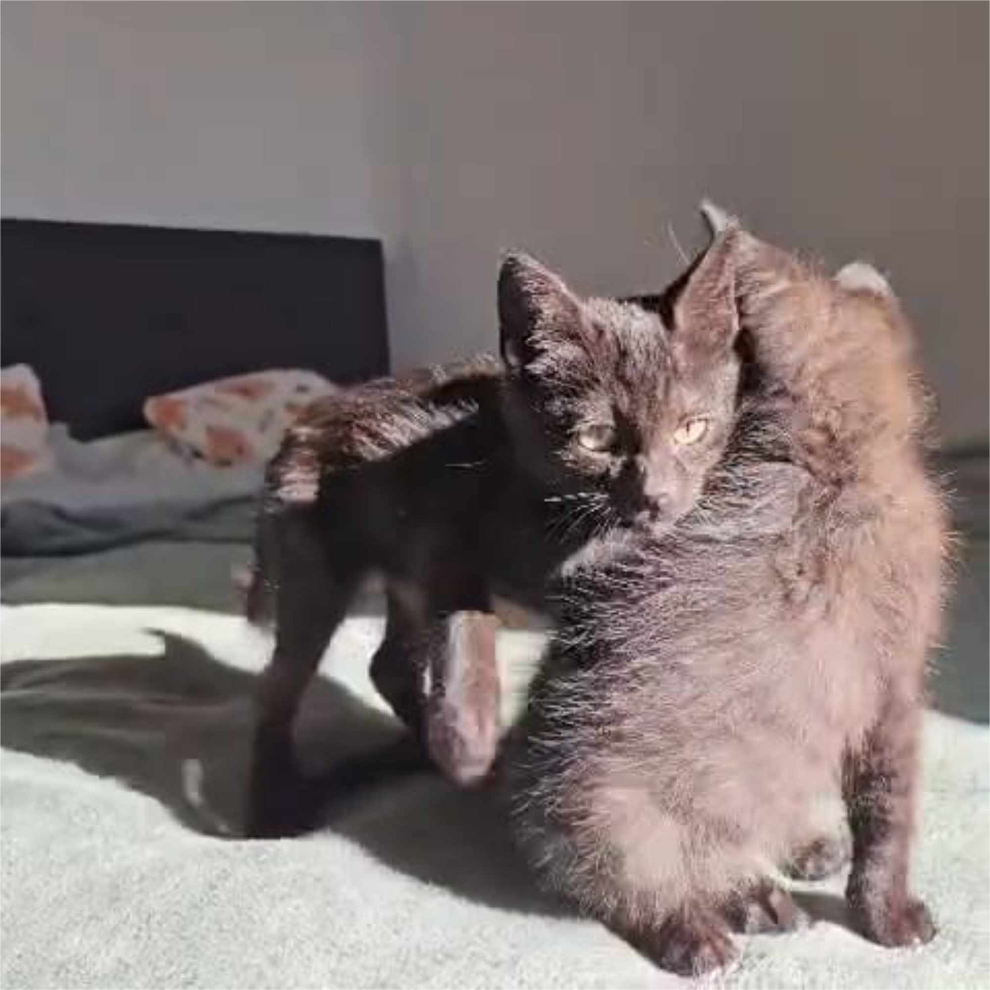 Cacao wears two white paws and a soft, ashy shimmer through his black coat, while Yoda is more slender, wrapped in a sleek, midnight-black pelt. They do everything together — chasing, tumbling, and, when the day winds down, gently grooming one another in the comfort of their shared bond.